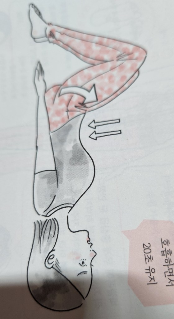 1. 똑바로 누워서 양쪽 무릎을 세운 후 항문이 위로 향하듯 허리늘 말고 등은 바닥에 댄다. 2.배꼽을 바닥에 붙이듯 쏙 집어넣으며 숨을 내쉰다