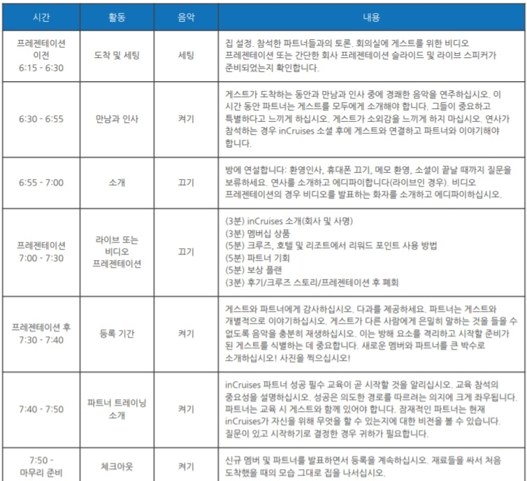 -게스트를 맞이하고, 음악볼륨을 조절하고, 시간을 지키고, 이름표를 작성하고, 로그인 시트를 감독할 팀 파트너를 지정하세요. -좋은 팀 파트너가 되십시오 다른 팀 파트너의 inCruises 소셜을 지원하는 것은 정중하고 도움이 됩니다. -주중에 일하고 파트타임으로 inCruises 비즈니스를 구축하고 있습니까? 주말 동안 여러차례 inCruises 소셜 및 그랜드 오프닝을 예약하고 지원하여 “주말 전사”가 되십시오. -가능하면 inCruises가 주간 비즈니스 미팅이나 기업 웨비나를 갖는 날에 같은 날에는 소셜을 예약하지 마십시오. 잠재적인 멤버나 파트너가 참석하여 다시 살펴보고 다른 inCruises 파트너를 만나고 의사결정 과정에 추가적인 지원을 받을 수 있습니다. -게스트가 도착하기 전에 참석한 inCruises 파트너와 간단한 회의를 진행하십시오 소셜 목표에 대해 토론하고 질문에 답하고, 도움을 줄 책임을 할당하십시오. -어떤 팀 파트너(5명 이하)가 회의실 앞으로 나올지 결정하고 30초 이내에 이름, 배경, 크루즈 및 배경 여행 이야기와 그들이 inCruises를 시작하게 된 이유를 공유하며, 평가를 제공하십시오 목표는 게스트와 연결하는 것입니다. -복장: 게스트보다 한 단계 높은 복장을 하십시오 비즈니스 캐주얼이 가장 좋습니다 참고- inCruises파트너는 미래의 “10억 달러” 비즈니스를 대표합니다! 성공을 위해 옷을 입되 과도하게 옷을 입히지 마십시오 -프리젠테이션 중에 inCruises 파트너 앞에 앉아서 메모를 해야 합니다. 프리젠테이션을 처음 본 것 처럼 프리젠테이션에 참여 하세요 게스트는 당신이 보이는 대로 할 것입니다. – inCruises 파트너 여러분 프리젠테이션 후 판매요청 잊지 마세요 게스트가 멤버가 되어 여행 멤버십 클럽에 가입 하도록 요청하십시오. “시작 할 준비가 되었나요?” 긍정적인 “예”를 얻기 위해 고개를 끄덕이며 “멤버십, 파트너십 또는 둘 다 중에서 무엇이 가장 좋습니까?” 또는 “정말 멋지죠?” 라고 말하세요. -노쇼나 관심이 없는 게스트에 대한 부정적인 이야기는 하지 마십시오 나타난 게스트에 집중하십시오 소셜은 게스트에 관한 것임을 기억하십시오. -당신이 발표자/연사라면 완벽할 필요는 없다는 것을 기억하십시오 사람들은 비즈니스에 참여하는 것이 아닙니다. 그들은 당신에게 합류합니다. 메모, 카드(간단한 복제)를 사용하고 도전, 가족, 희망, 꿈, 및 크루즈를 타고 싶은 곳을 공유하여 게스트가 귀하와 동일시 할 수 있도록 합니다. -게스트가 그들의 필요의 진심으로 관심을 가지십시오 그들을 흥미롭게 하려고 하지 마십시오. -전체 프리젠테이션이 짧고 단순하며 열정적이고 유익하고 견고하게 하세요. -휴대전화, 통화, 문자메세지 프리젠테이션 중 화장실 사용 등은 게스트와 다른 파트너에게 방해가 되기 때문에 금지하세요. -게스트가 참여하게 하려고 과대광고, 구걸 또는 설득을 하지 마십시오. -환경을 제어 하세요 부정적인 게스트가 있을경우 정중하게 나가도록 요청하십시오. -사진을 찍으십시오 새로운 멤버와 파트너를 큰 박수로 발표하세요! 사람은 누구나 인정 받기를 좋아합니다. “모두 주목 하세요…inCruises가족이 되신것을 환영합니다(이름을 말하세요)” -모든 inCruises 파트너는 등록 기간 후에 파트너 성공 필수 교육에 계속 참여해야합니다.